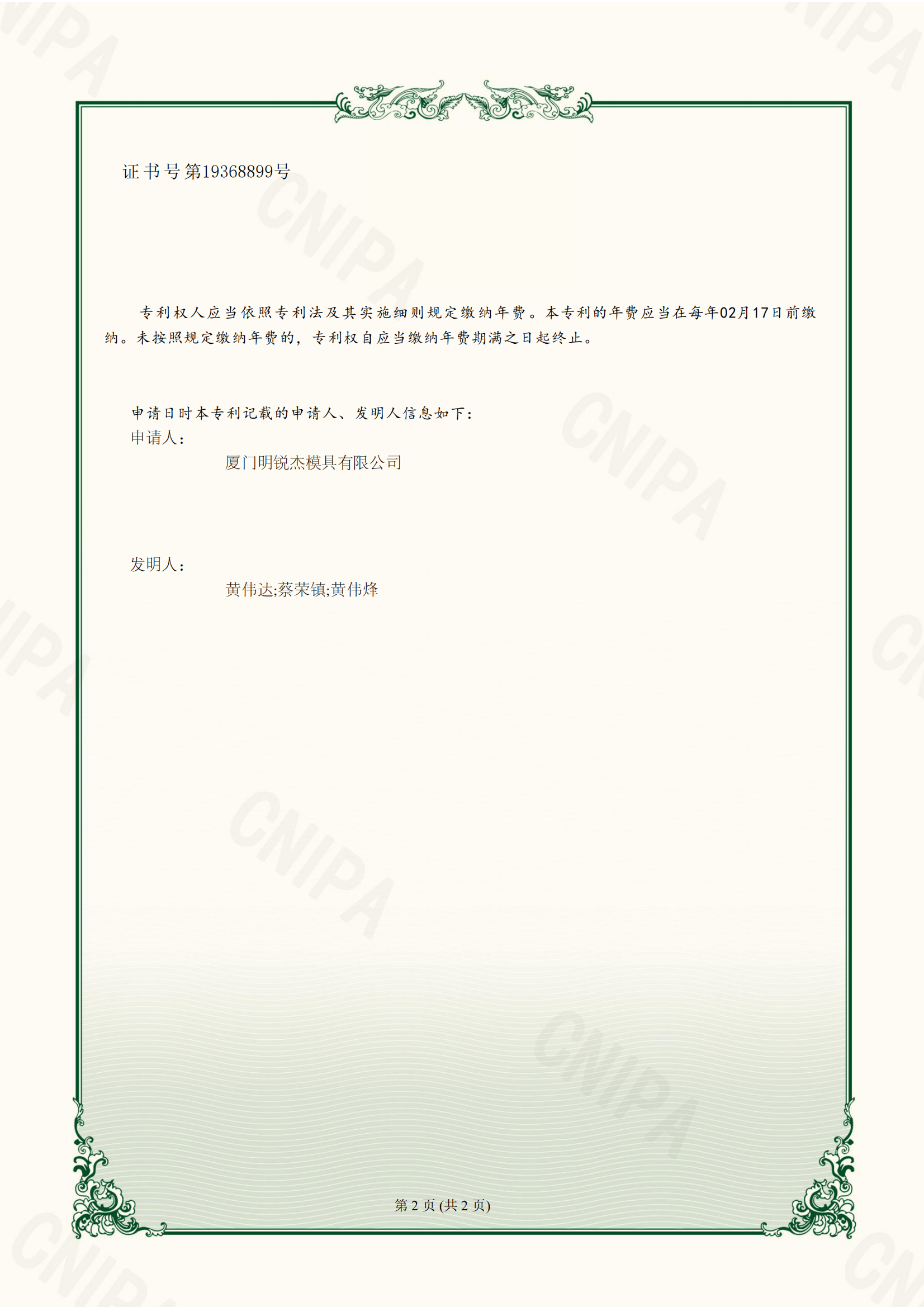 明锐杰模具 P72937 证书(ZL202320243965.8 二次抽芯脱模机构)